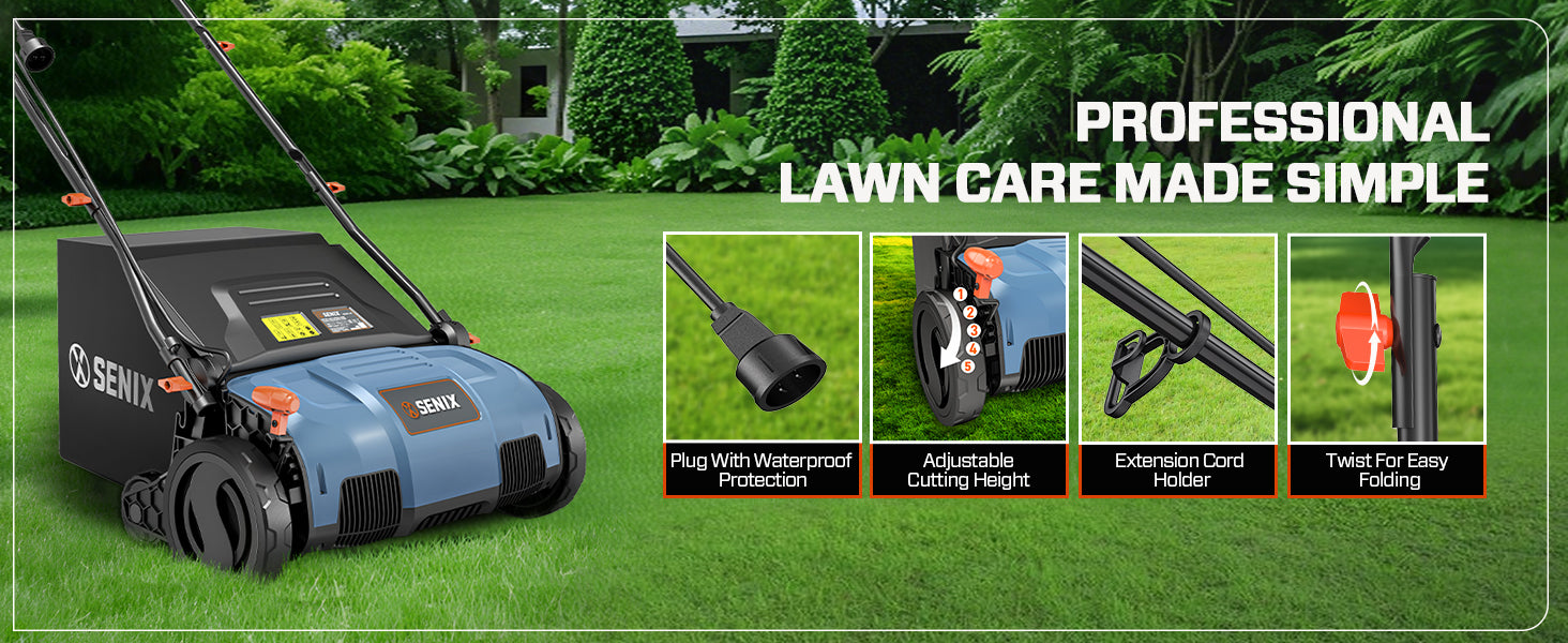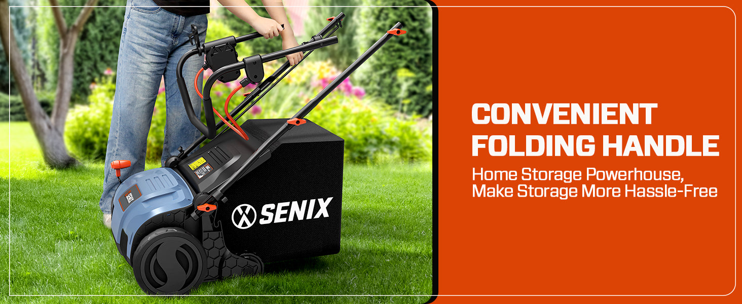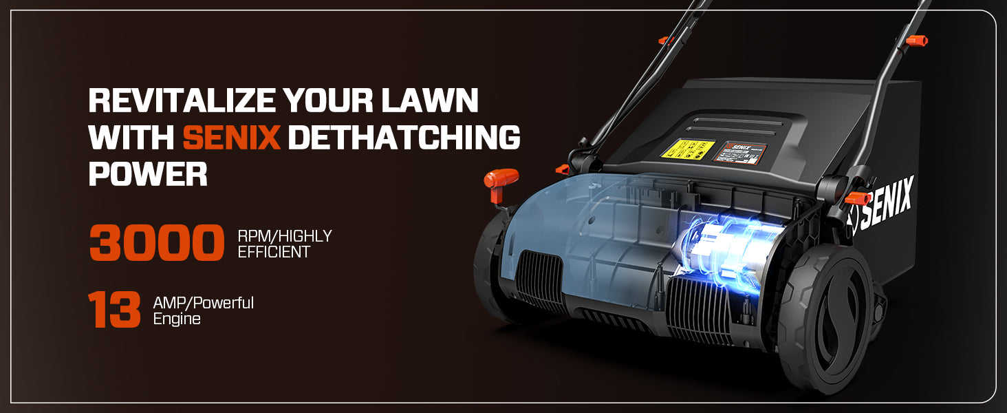 Don't settle for less when it comes to your lawn. This SENIX robust 15-Inch 13 Amp Lawn Scarifier and Dethatcher delivers a precise 0.4-inch scarifying depth through its 26 slicing blade cylinder, ensuring optimal lawn health. The Dethatcher Cylinder is equipped with 24 spring steel raking tines, each 1.5 MM thick, providing thorough dethatching at a convenient 0.4-inch height. Efficiency meets capacity with a generous 13.2-gallon thatch bag, allowing you to cover more ground without interruptions. This lawn scarifier and dethatcher from SENIX is meticulously crafted to offer superior performance and convenience.