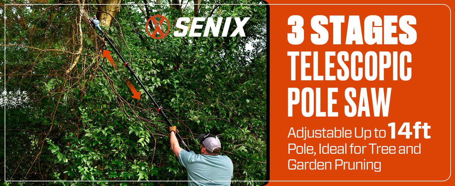 The 3-stage extension pole provides up to 14 feet of reach, allowing you to safely cut high branches without the need for a ladder.