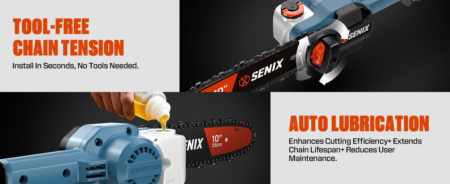 The auto chain oiler provides continuous lubrication for smoother cuts and longer blade life, while the tool-free tensioning allows for quick chain adjustments with a simple twist dial.