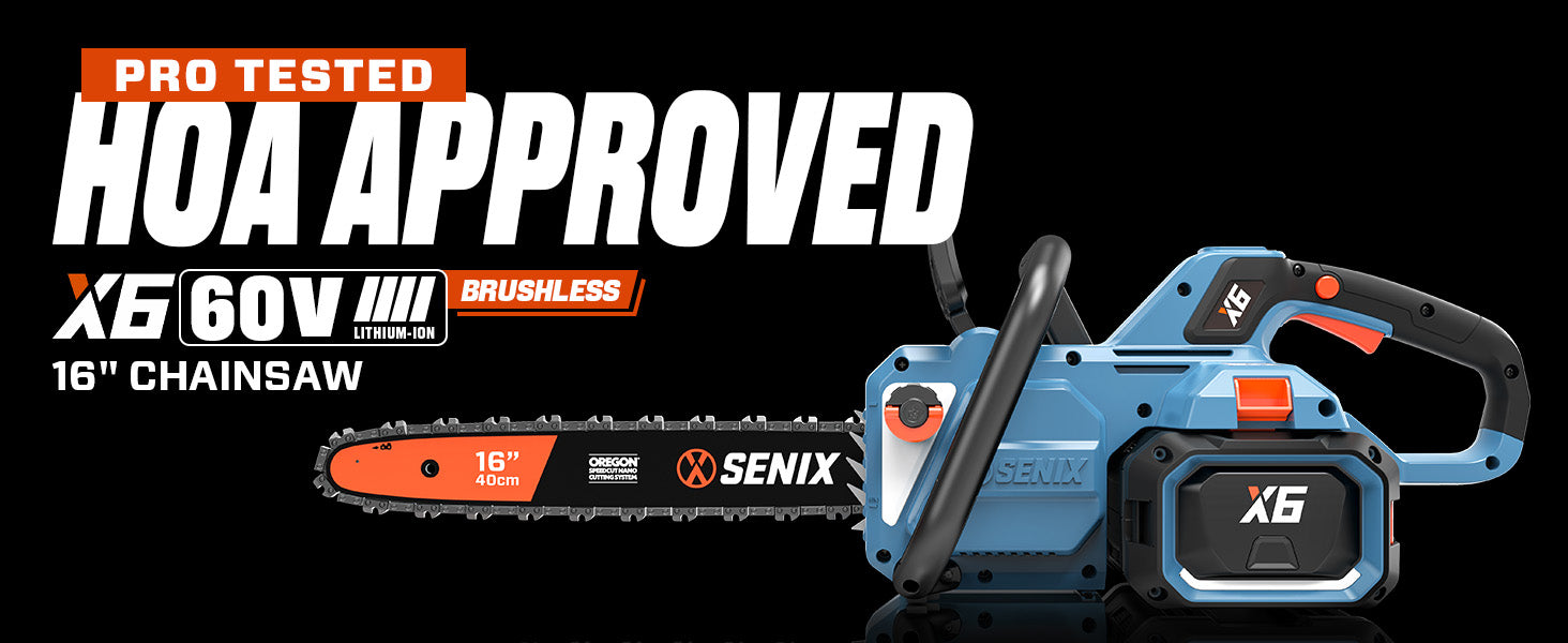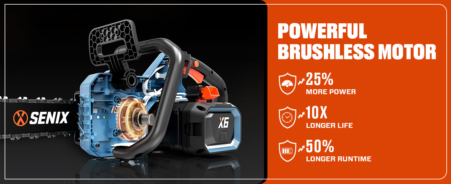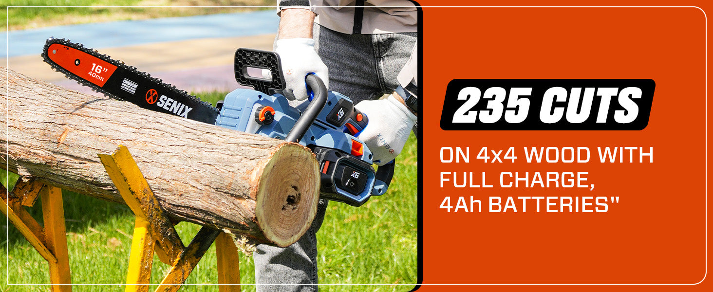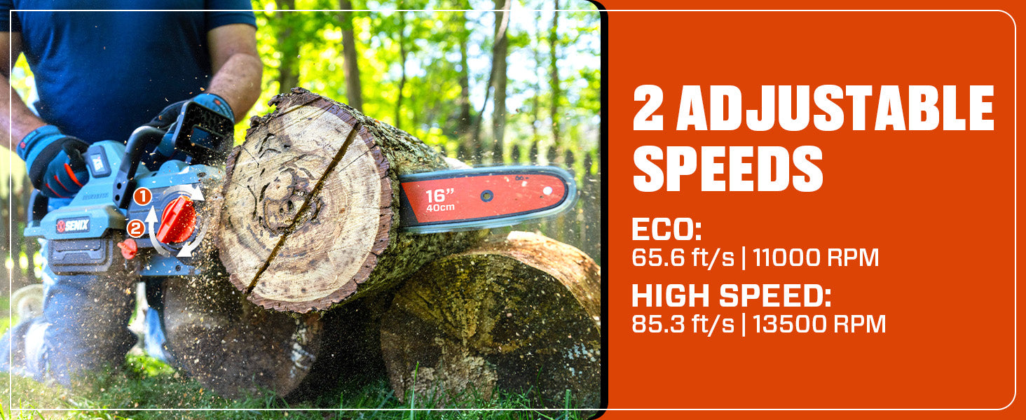 Setting a new standard in performance, the SENIX X6 60V Max 16-Inch Brushless Cordless Chainsaw boasts an industry-leading 26m/s ultra-high chain speed, maximizing productivity, and ensuring swift and efficient cutting. The Oregon® Speedcut Nano High-Performance Bar & Chain guarantees smooth cutting performance, elevating your cutting experience to unprecedented levels. Our tool-free chain tensioning system simplifies maintenance with a quick twist of a dial, offering unparalleled convenience. Activate the ECO Mode to optimize performance, allowing you to tackle tasks with precision while conserving energy. Powered by a brushless motor, this chainsaw delivers maximum power, extended runtime, and a longer motor life, surpassing the capabilities of standard chainsaws. The package includes a 4.0 Ah Lithium-Ion Battery and a 3A Charger, ensuring you're ready for any cutting challenge. Plus, with our 5-year limited warranty on the tool and 3-year limited warranty on the battery and charger, you can trust in the durability and quality of our product. Choose the SENIX 60V Cordless Chainsaw for a superior cutting experience that surpasses industry standards.