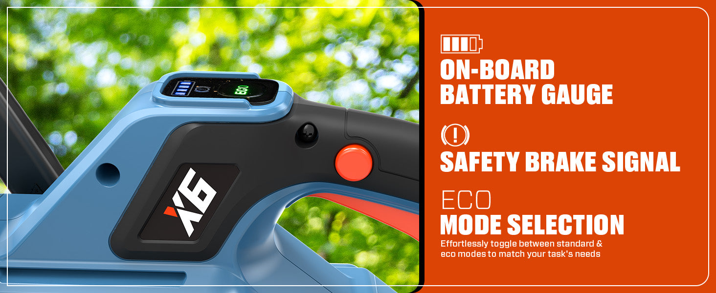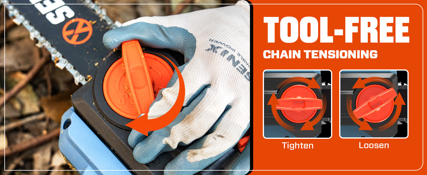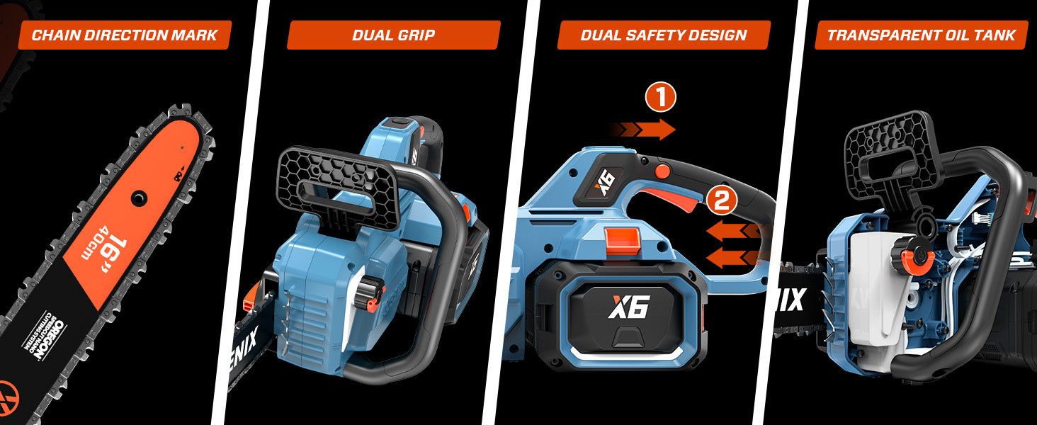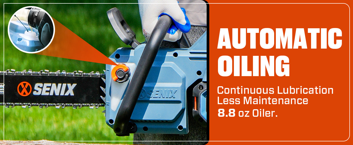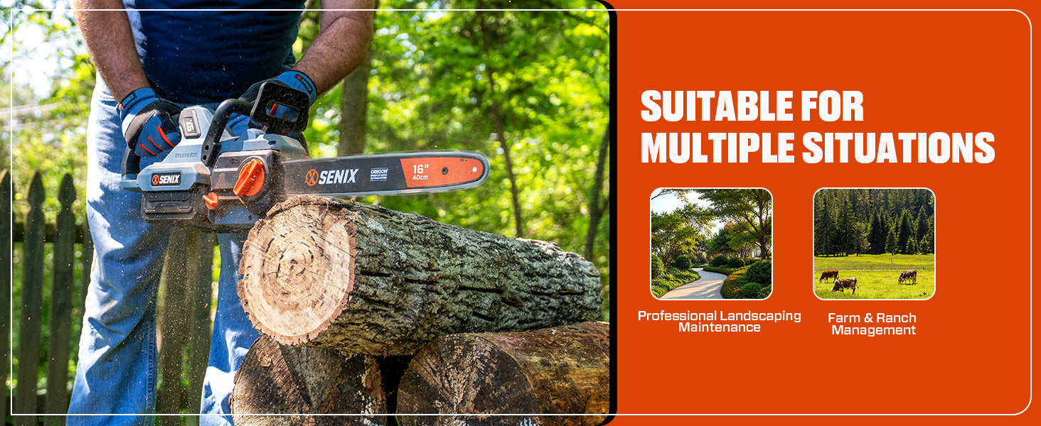 Setting a new standard in performance, the SENIX X6 60V Max 16-Inch Brushless Cordless Chainsaw boasts an industry-leading 26m/s ultra-high chain speed, maximizing productivity, and ensuring swift and efficient cutting. The Oregon® Speedcut Nano High-Performance Bar & Chain guarantees smooth cutting performance, elevating your cutting experience to unprecedented levels. Our tool-free chain tensioning system simplifies maintenance with a quick twist of a dial, offering unparalleled convenience. Activate the ECO Mode to optimize performance, allowing you to tackle tasks with precision while conserving energy. Powered by a brushless motor, this chainsaw delivers maximum power, extended runtime, and a longer motor life, surpassing the capabilities of standard chainsaws. The package includes a 4.0 Ah Lithium-Ion Battery and a 3A Charger, ensuring you're ready for any cutting challenge. Plus, with our 5-year limited warranty on the tool and 3-year limited warranty on the battery and charger, you can trust in the durability and quality of our product. Choose the SENIX 60V Cordless Chainsaw for a superior cutting experience that surpasses industry standards.