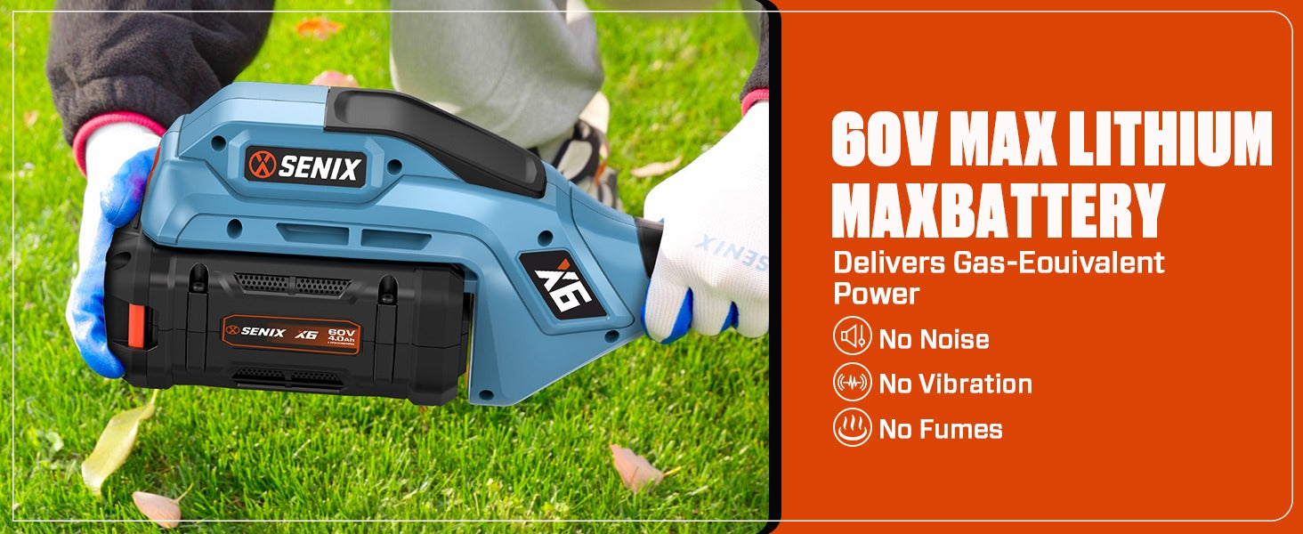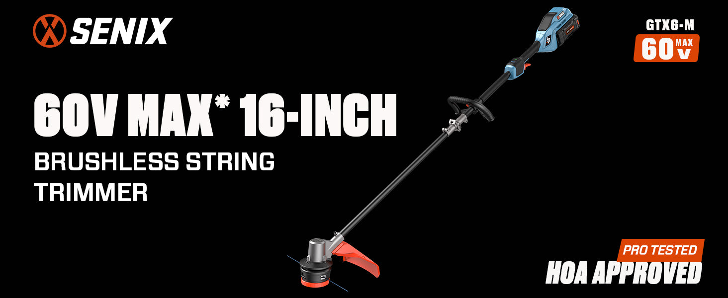 The SENIX X6 60V Max Cordless String Trimmer delivers professional-grade cutting power without the noise, maintenance, or fumes of gas. Powered by a high-efficiency 60V lithium-ion battery, this trimmer packs serious torque to tackle thick weeds, dense overgrowth, and tall grass with ease. The durable brushless motor runs cooler and lasts longer than traditional brushed motors, giving you consistent performance and longer runtime with every charge. A 16-inch cutting swath and 0.095-inch dual-line bump feed head let you cover more ground in less time, while the variable speed trigger gives you full control when edging or trimming around tight spaces. Designed for demanding homeowners and DIYers, the SENIX X6 60V Max Cordless String Trimmer is built tough and engineered for comfort. The lightweight, balanced design and adjustable front handle reduce fatigue during extended use, making it easy to trim your entire yard on a single charge. Whether you're maintaining a small lawn or reclaiming overgrown property, this cordless string trimmer delivers gas-like power without the hassle. Plus, with our 5-year limited warranty on the tool and 3-year limited warranty on the battery and charger, you can trust in the durability and quality of our product. Say goodbye to pull cords and messy fuel — and step up to the next level of cordless yard tools.