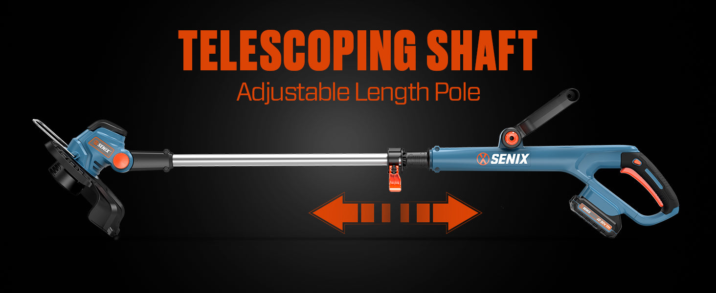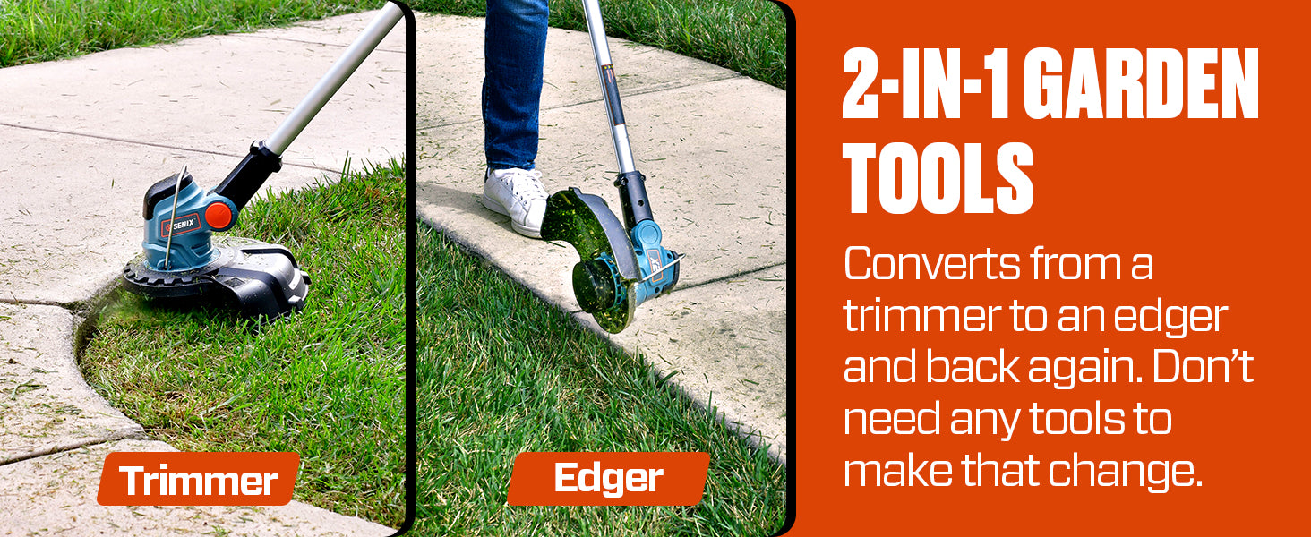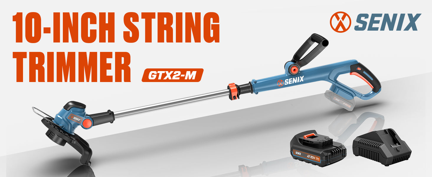 The SENIX X2 20V Max* Cordless String Trimmer features a single .065-inch line for better balance and low vibration. The 360-degree front handle allows for comfortable cutting and trimming at any angle. The 10-inch cutting path allows for work in tight areas and longer run time. For use with SENIX 20V Max* batteries and CHX2 2 Amp charger. Battery and charger are included. All SENIX 20 Volt Max* cordless products are backed by our 5-year limited warranty and all SENIX lithium-ion batteries and chargers are backed by our 3-year limited warranty for your peace of mind.