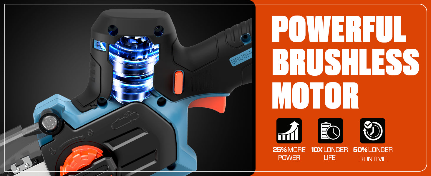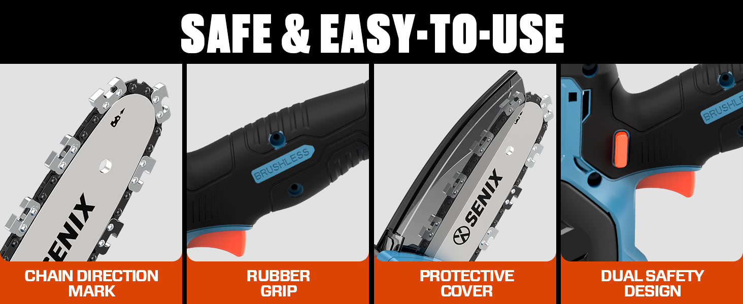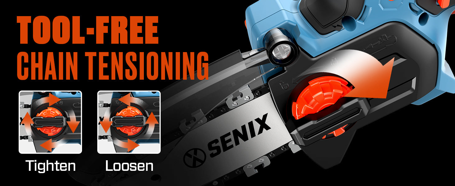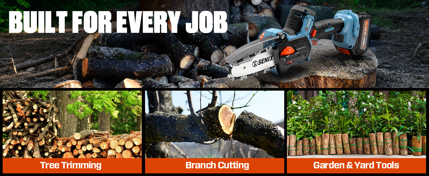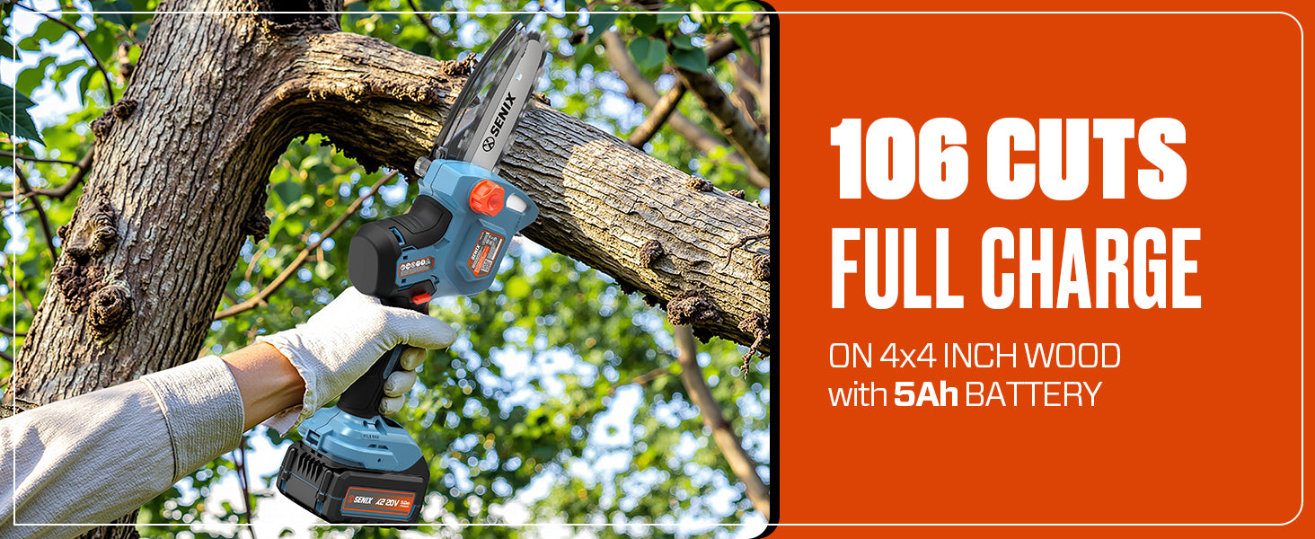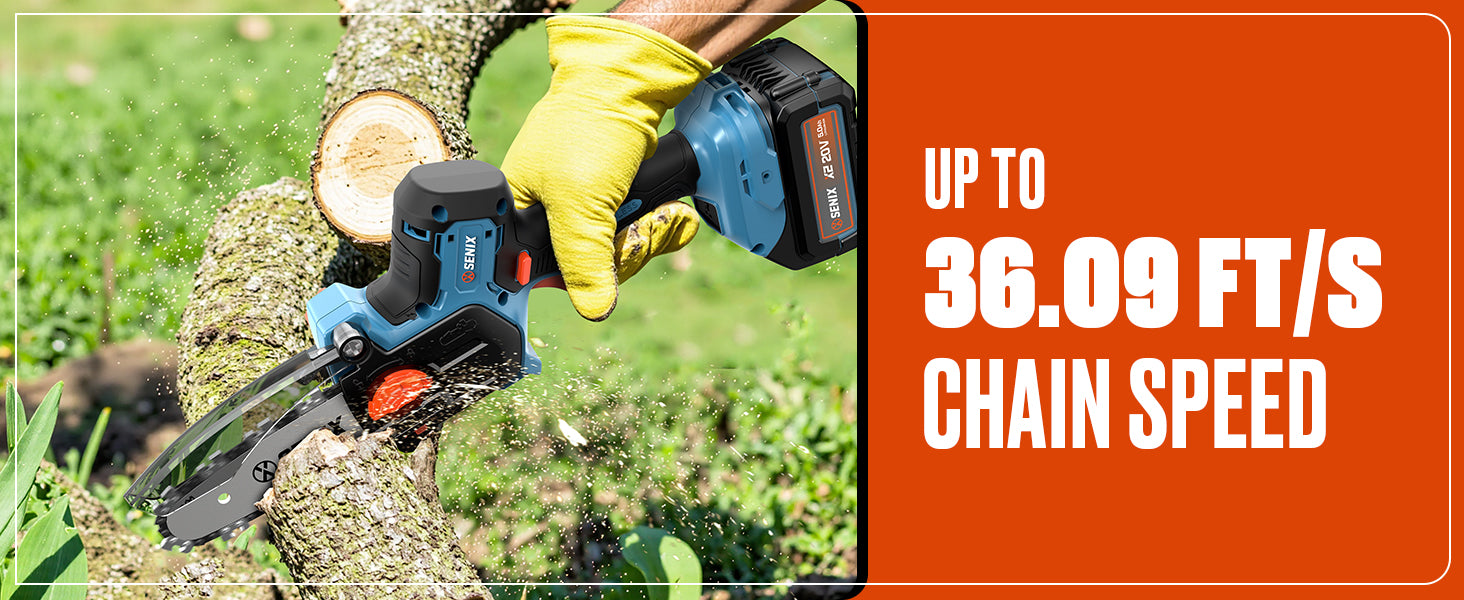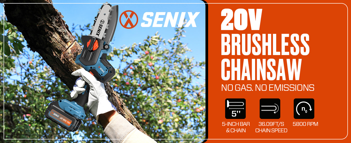 Meet the SENIX X2 20V 5" Mini Cordless Chainsaw, your new go-to for all your wood cutting and gardening needs. With a blazing 11m/s chain speed, it makes quick work of tree branches and pruning tasks, effortlessly cutting up to 4.7" in a single go. Its lightweight design means you can easily handle and carry it around, making your job that much easier. Plus, the brushless motor ensures you get maximum power, longer runtime, and extended motor life. Whether you're a gardening enthusiast or just need to tidy up the yard, this easy-to-use tool has got you covered.