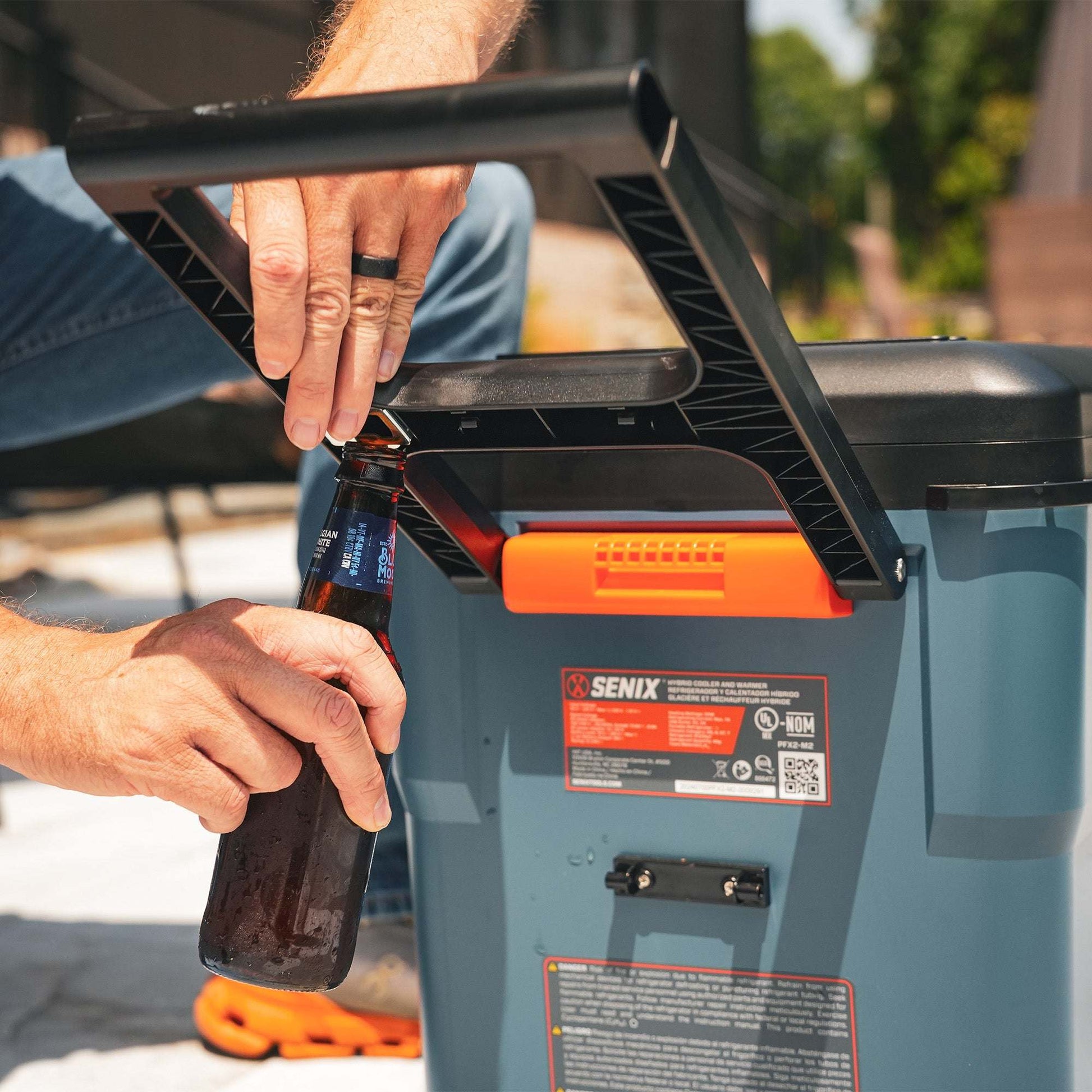 Take your outdoor adventures, tailgates, and road trips to the next level with the SENIX 26.4 Quart Portable Cooler/Warmer. This powerhouse unit offers massive 26.4-quart capacity, capable of holding up to 40 12oz cans to keep your drinks chilled or warm all day long. Whether you're cooling beverages or warming food, the dual-mode temperature control allows you to switch between cooling and warming modes, ranging from 0°F to 140°F, giving you ultimate flexibility for any occasion. With a user-friendly LED display, you can effortlessly manage temperature settings and monitor battery life. This cooler/warmer also features built-in USB and Type-C ports, perfect for charging electronic devices while you're on the go. Stay powered up no matter where you are with 2 battery ports that allow continuous power from any X2 20V battery, along with 120-volt AC wall adapter or 12-volt car adapter compatibility. Designed for convenience and mobility, this cooler/warmer boasts large wheels and a carry handle for easy transport, while anti-skid feet ensure stability on any terrain. The integrated battery charger makes switching between outdoor and indoor power sources seamless. Plus, with two bottle openers, built-in cup holders, and 7 vibrant LED lights, this cooler/warmer is the life of any party.